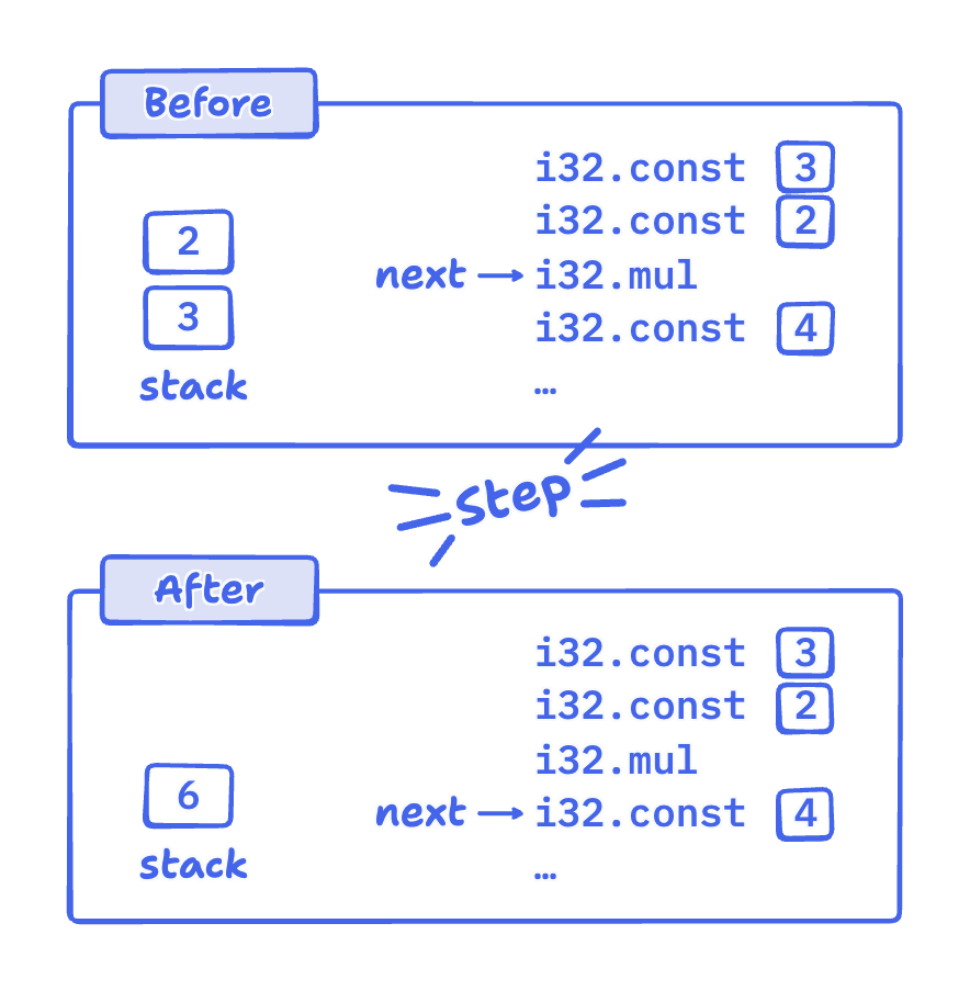 Here’s a diagram showing the state of an interpreter, before and after it executes an i32.mul instruction: